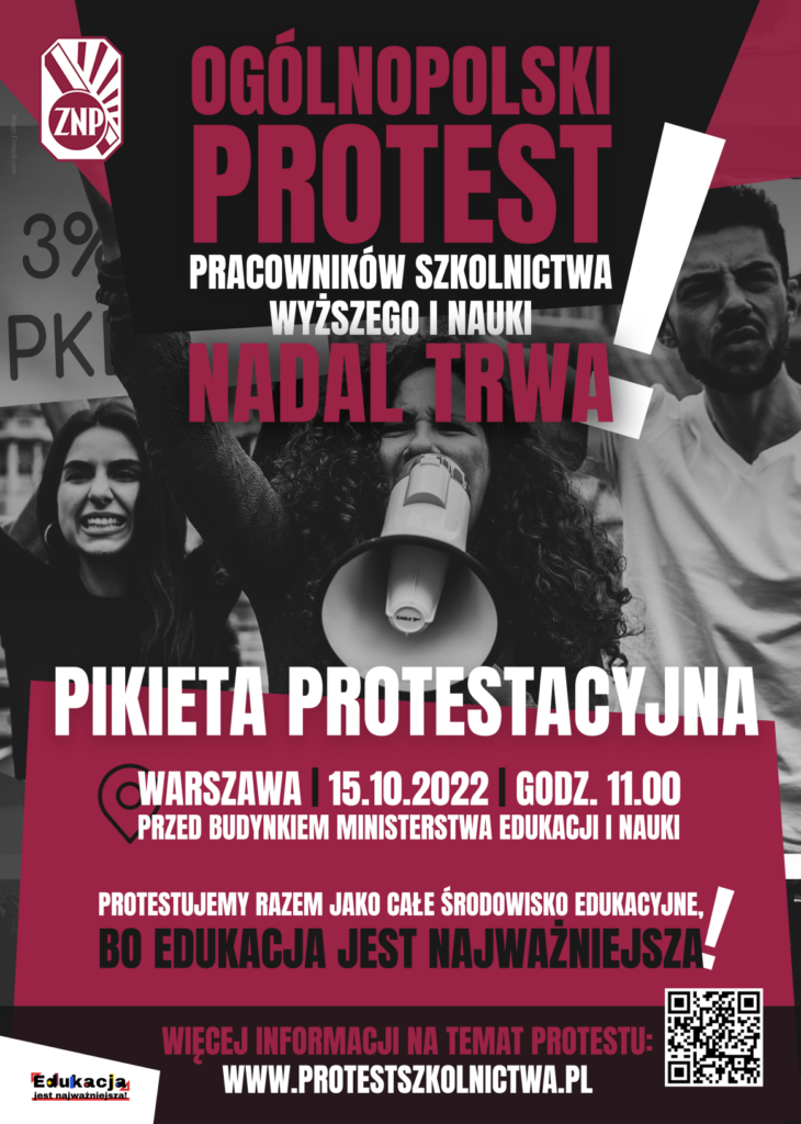 W sobotę 15 października pod siedzibą Ministerstwa Edukacji i Nauki, na ul. Szucha w Warszawie odbyła się pikieta zorganizowana przez Związek Nauczycielstwa Polskiego. To ciąg dalszy trwającej od grudnia zeszłego roku akcji protestacyjnej, mającej na celu poprawę sytuacji nauczycieli i pracowników zatrudnionych w placówkach edukacyjnych, w tym też w szkolnictwie wyższym i edukacji.